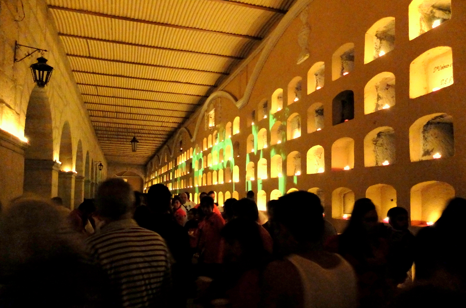 Night scene with candles illuminating a wall of tombs at the main cemetery in the city of Oaxaca.