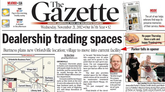 Many newspapers in small to medium sized U.S. cities are adopting a “hyper-local” format. If you live in a large city such as Chicago, New York, or L.A., you may not have taken note of this trend. Take a look at the following front page from a recent issue of the Janesville Gazette. Janesville, Wisconsin (recently famous for being Vice-Presidential Nominee Paul Ryan’s home town) is a city of 65,000 people and its newspaper, the Gazette, is published seven days a week. About three years ago, suffering from lagging subscriptions and declining readership, the Gazette switched to a “hyper-local” format. This format emphasizes local news for and about the Janesville community and its immediate geographical region. I suggest you click on the image in order to see the details clearly.